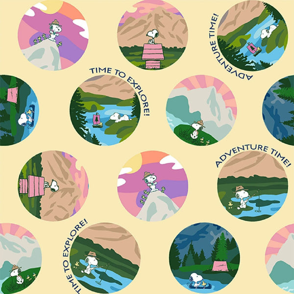 The Peanuts Snoopy Adventure Awaits fabric features different scenes of Snoopy enjoying adventures and exploring. It is designed by Springs Creative. Official licensed product for personal use only.