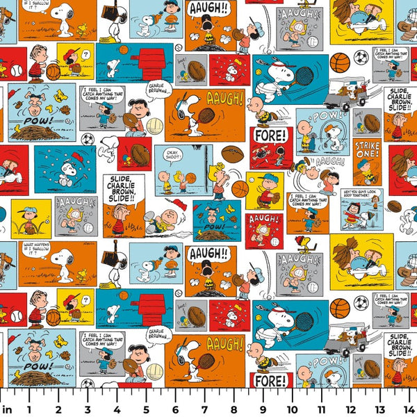 The Peanuts Sports & Aaugh! fabric features a comic-style print full of Peanuts sports moments. It is designed by Springs Creative. Official licensed product for personal use only.